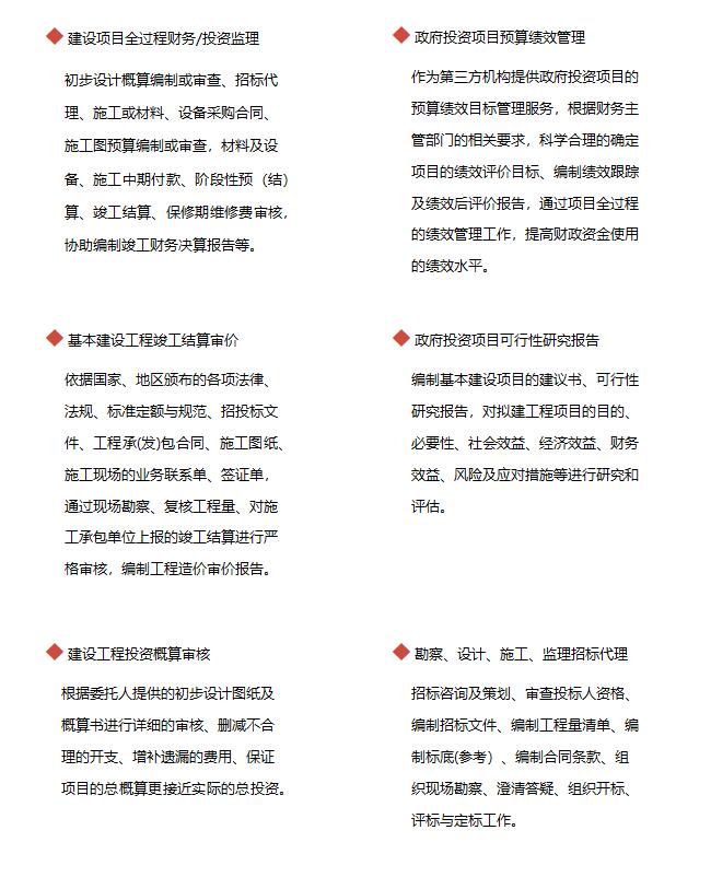 建设项目全过程财务/投资监理;基本建设工程竣工结算审价;建设工程投资概算审核;政府投资项目预算绩效管理;政府投资项目可行性研究报告;勘察、设计、施工、监理招标代理。